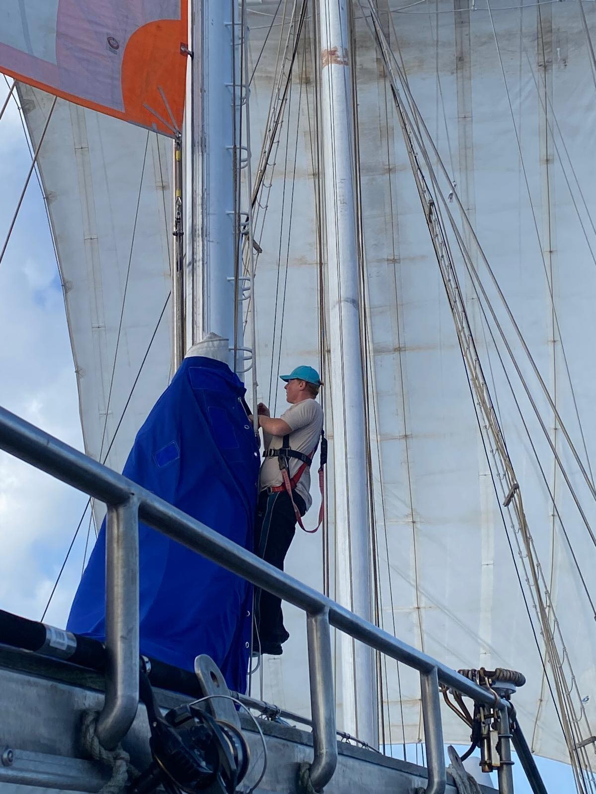 After that, we got the trysail down and packed it, which was also a lot of work because the sail must be packed with ropes “aus Hanf”. This is because, for setting the sail, you must put the sail on the mast, and for opening it you must bring so much pressure on the sheet that the “Hanf” rope springs.