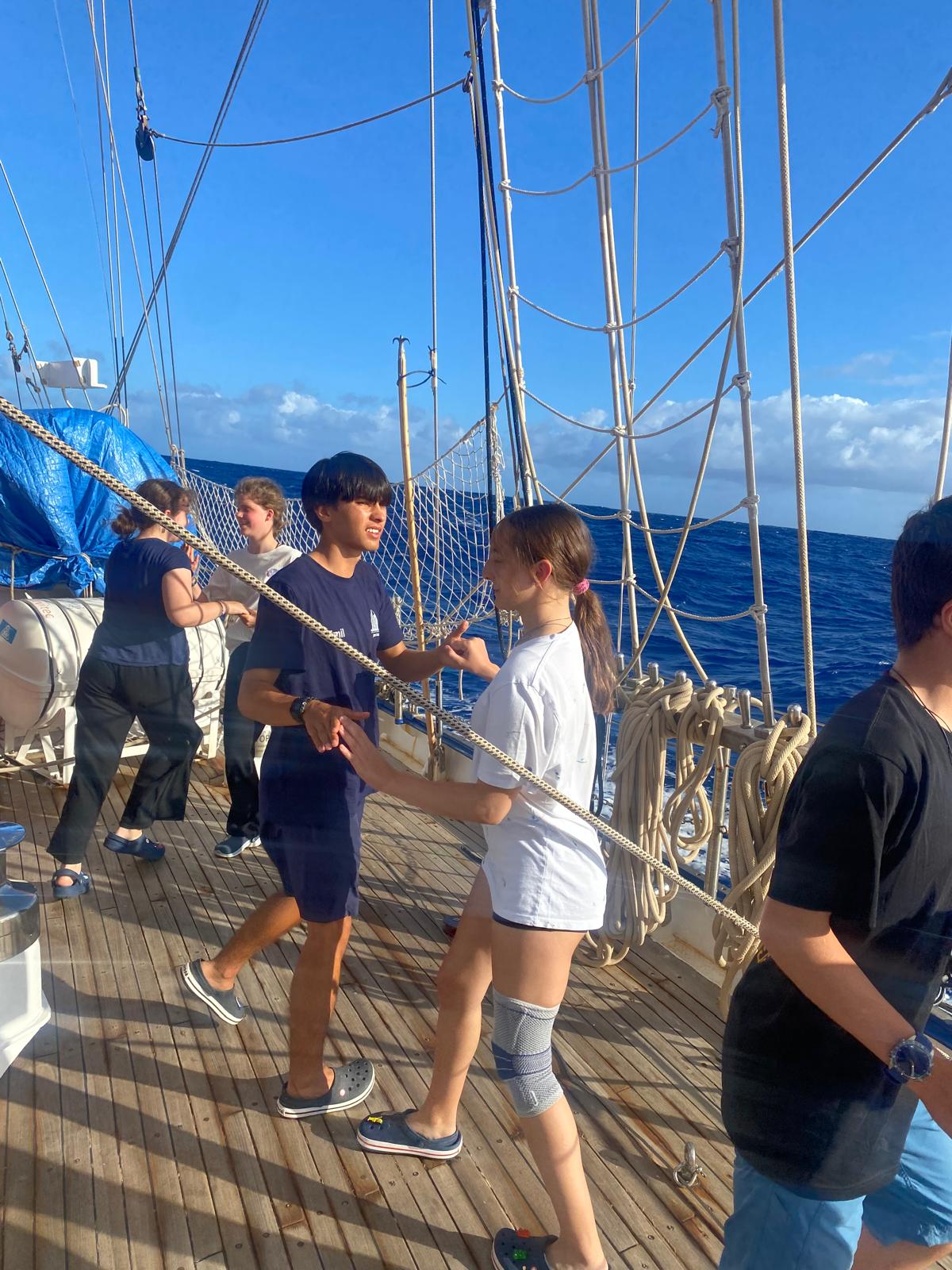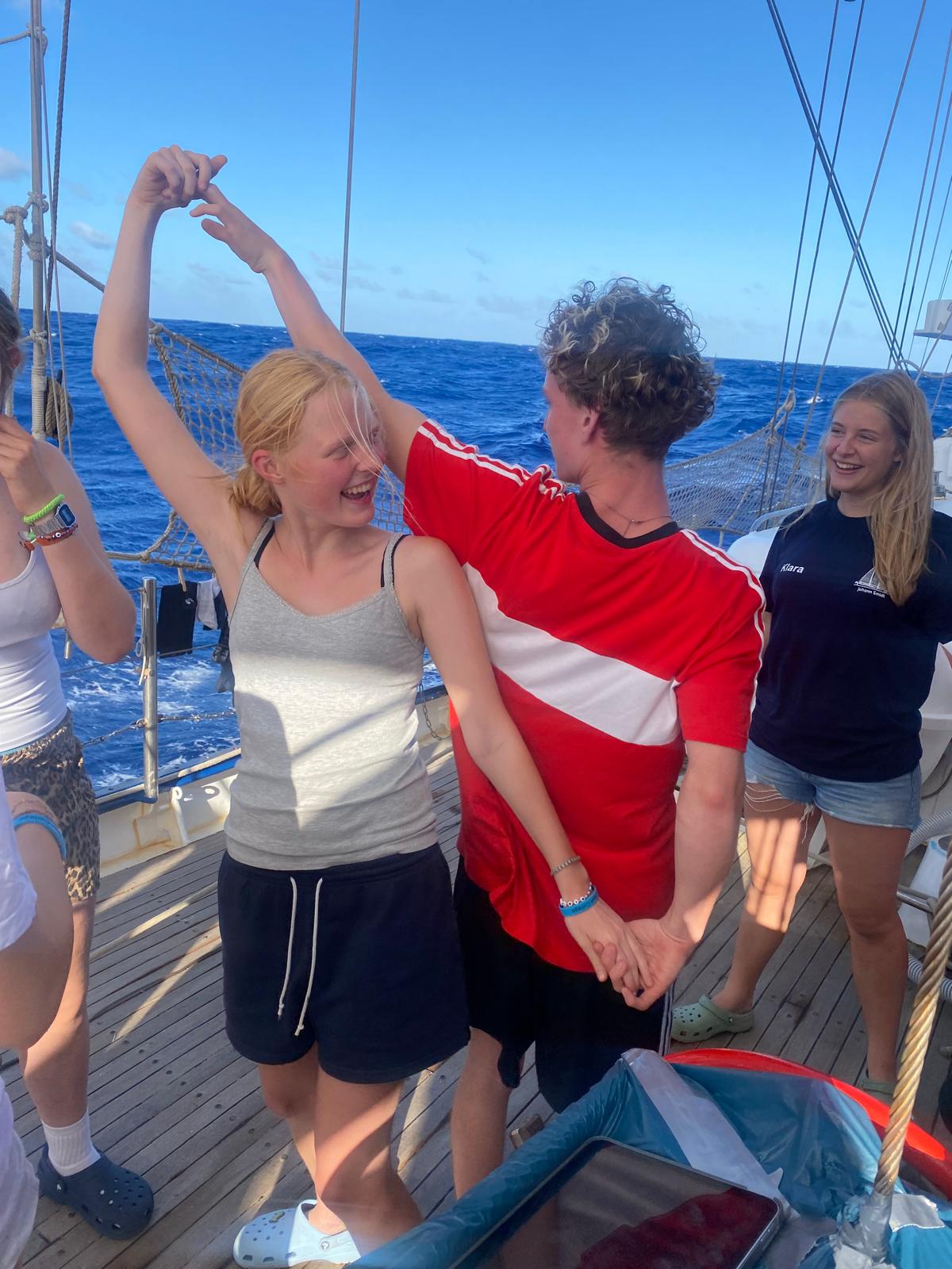 Today, during the AG time, we had a Friesenrock dance course on the front deck. With Cecily and Nepomuk as teachers, most of us can now proudly say that they even master the “Ludwig”. Only the Ylvapold still causes many difficulties. The dance course was super fun and now we all feel well prepared for the Mid-Atlantic Ball, which will be soon.