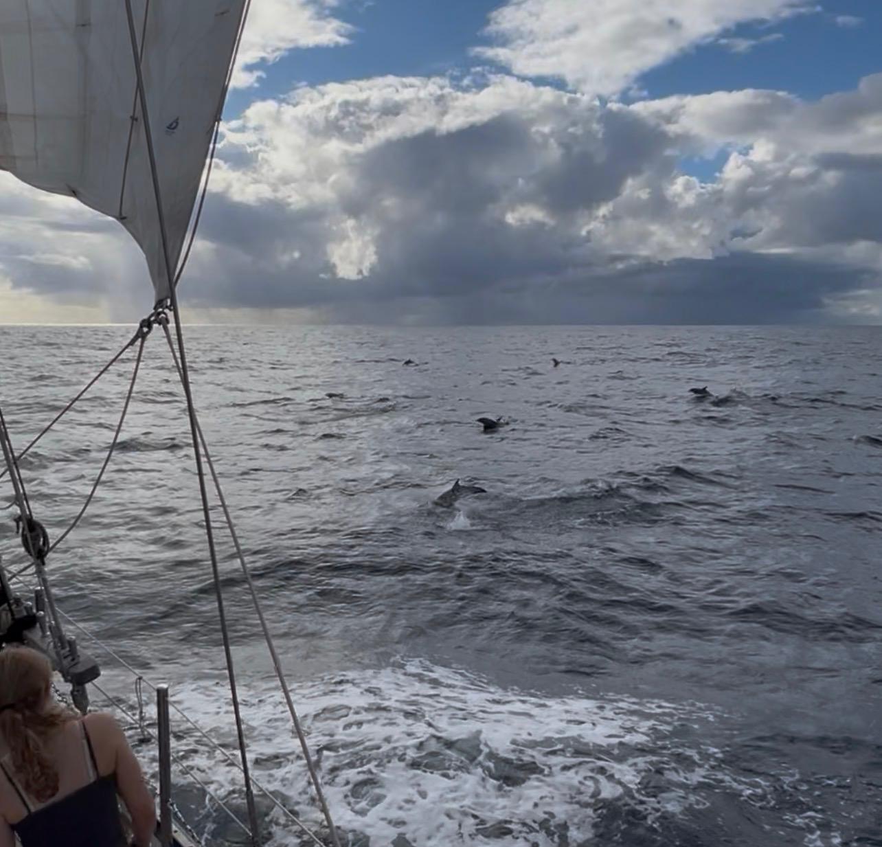 Während des Wäschewaschens begrüßte uns auf einmal eine sehr aufgedrehte, riesige Gruppe Delfine, die auf uns zugesprungen und zugeschwommen sind und ein paar Meter mit uns mitgeschwommen sind. Einer der Delfine kam sogar senkrecht aus dem Wasser und sprang locker vier Meter in die Höhe.