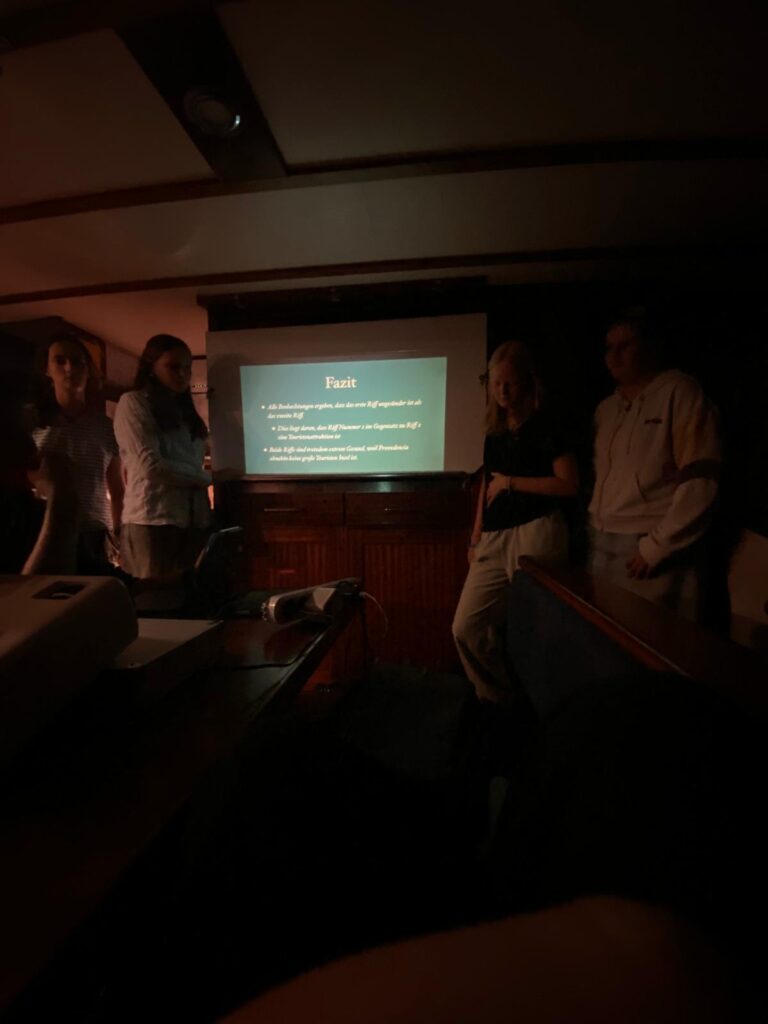 The day started with a super delicious breakfast: Chocolate rolls and scrambled eggs. According to the Green Plan, the school group had self-learning time. However, for some it was already over after an hour because they had to do deck work as a punishment.
