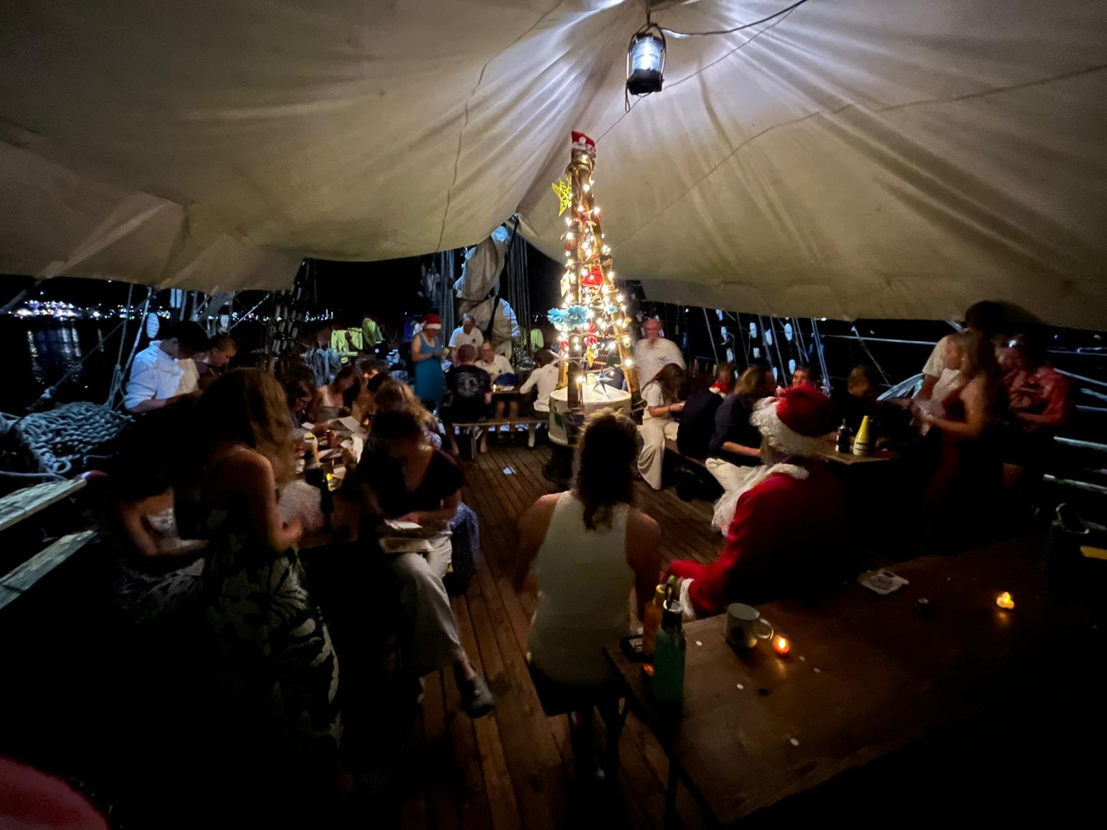 After our swimming time we had some free time on deck where some of us decorated the ship and built a Christmas tree on the spill. For me, I explained „Idiotenspiel“ to some of my friends, because that’s a game we always play at Christmas with my Family – the others said it was very fun wich made me happy 🙂