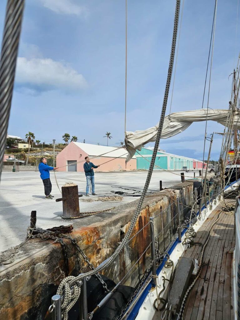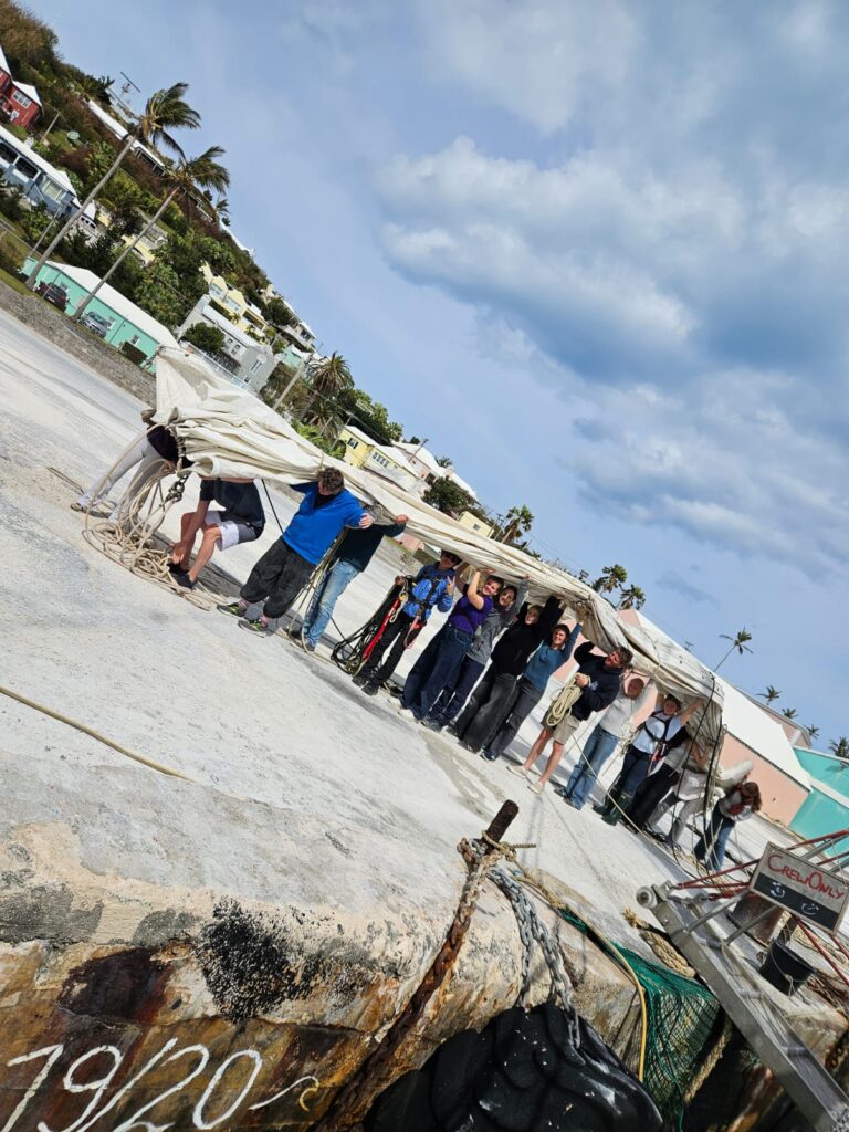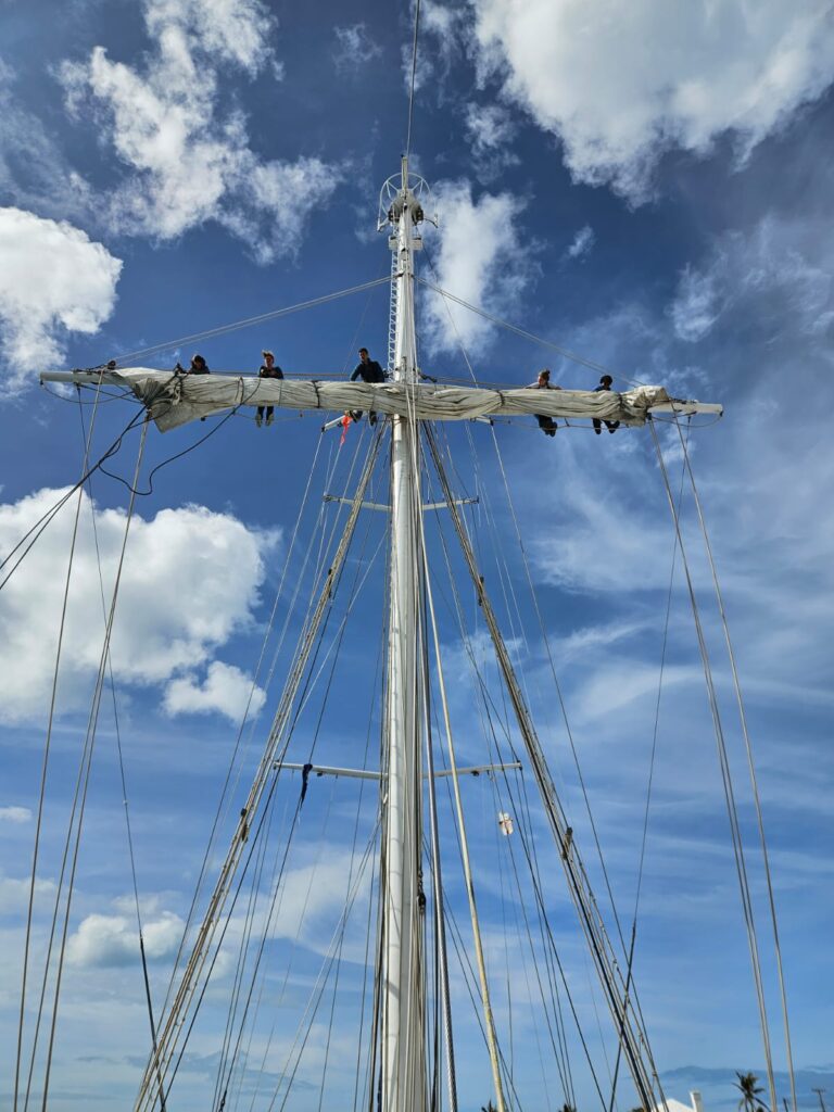 So, as you guys may know, our Rahsail ripped on the Atlantic Ocean. So we had to take it off 🙂 Yayyyyy, it happened like this: First six people had to climb up the mast, then they had to cut the more than 40 knots holding the sail up.